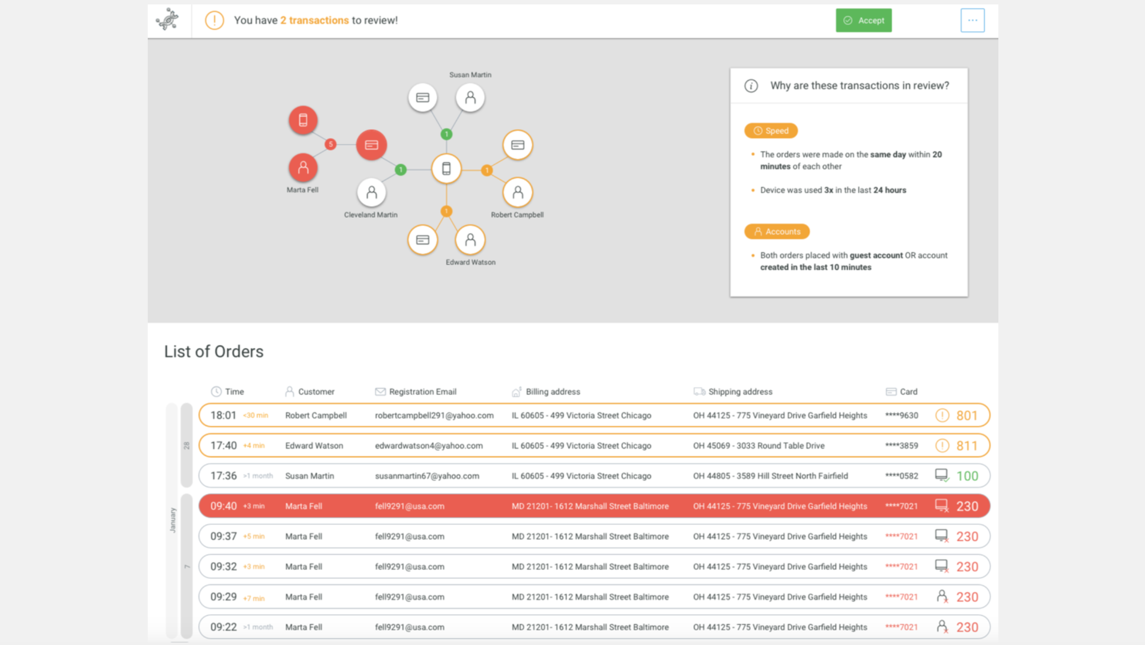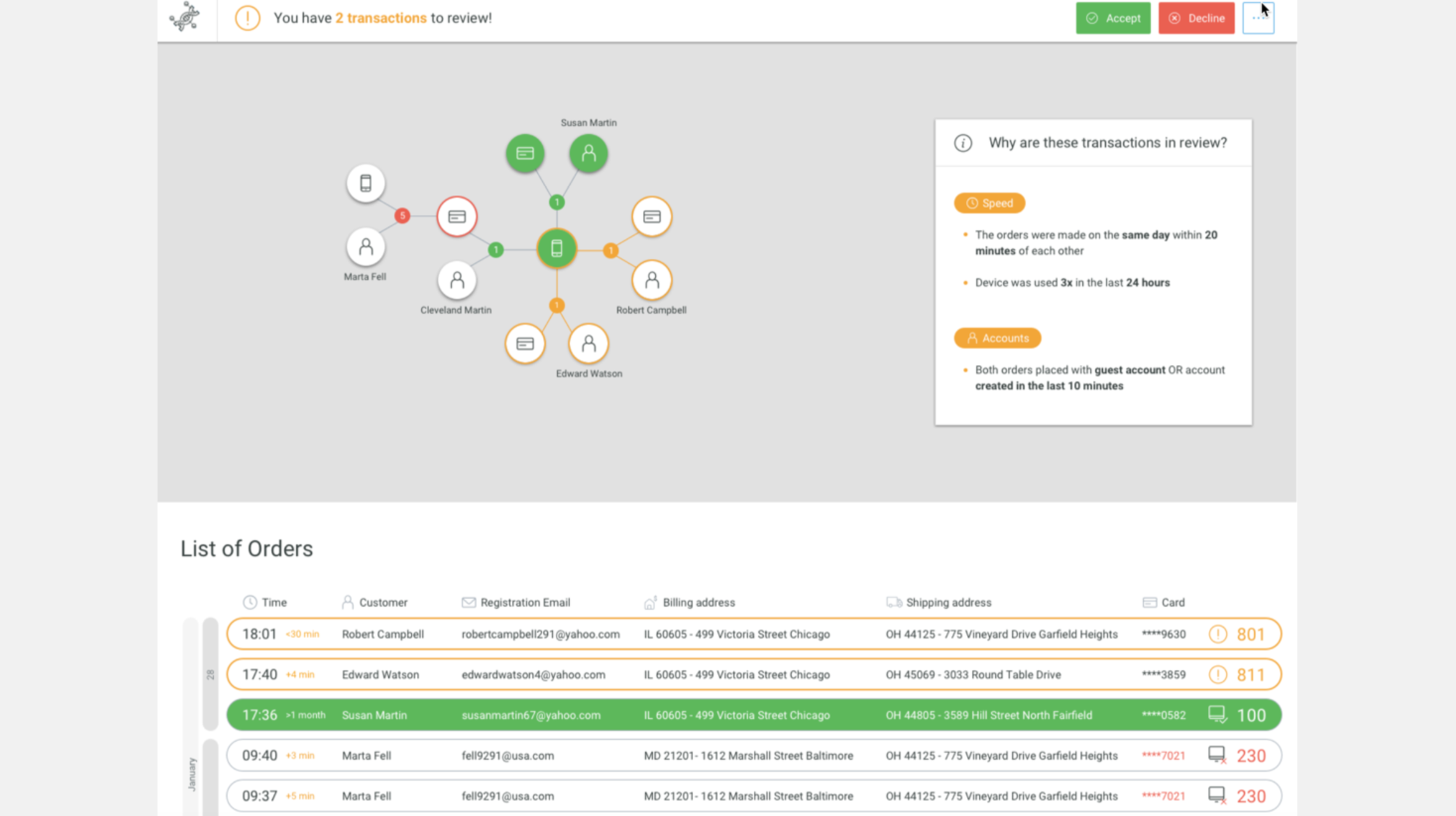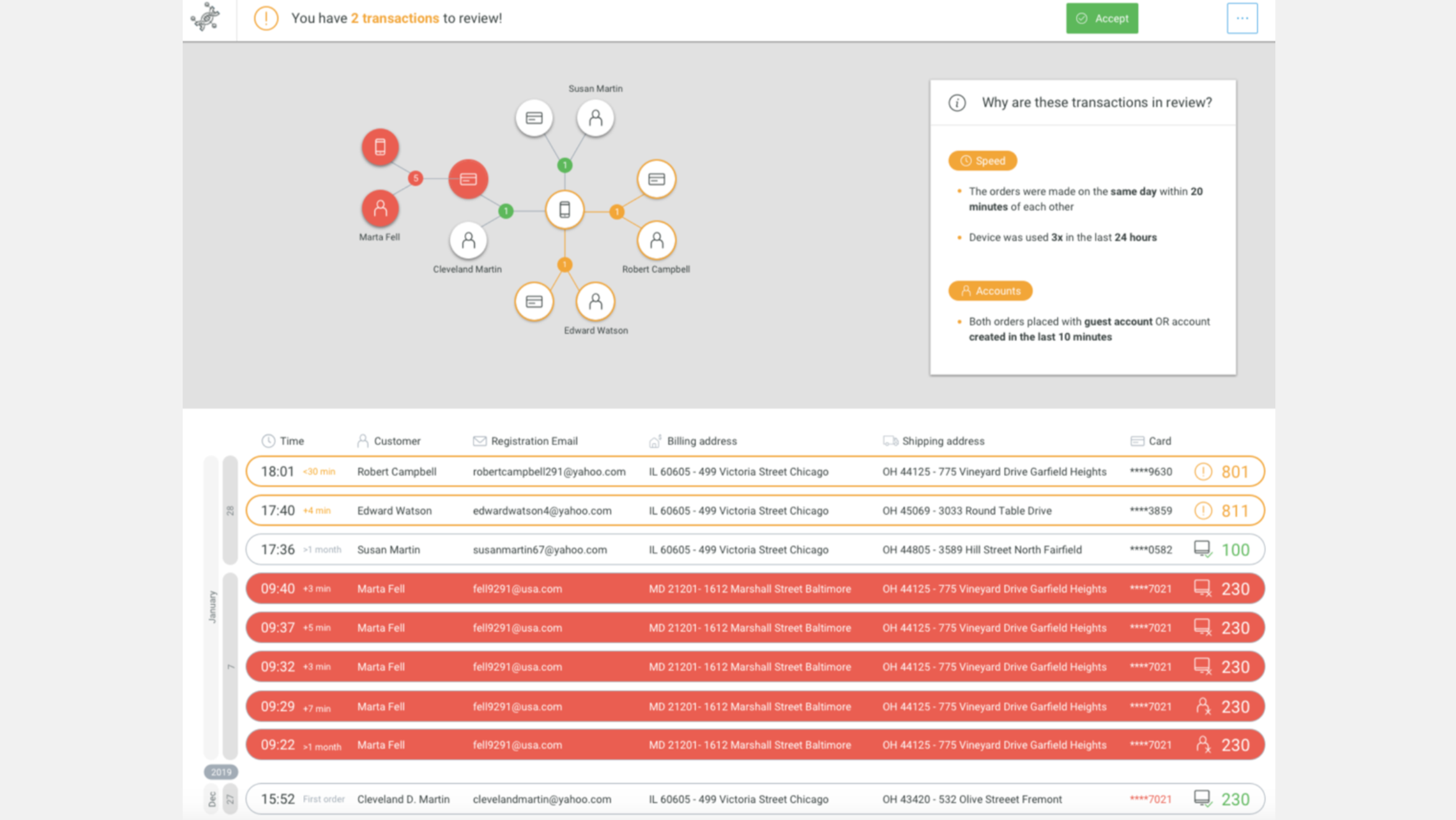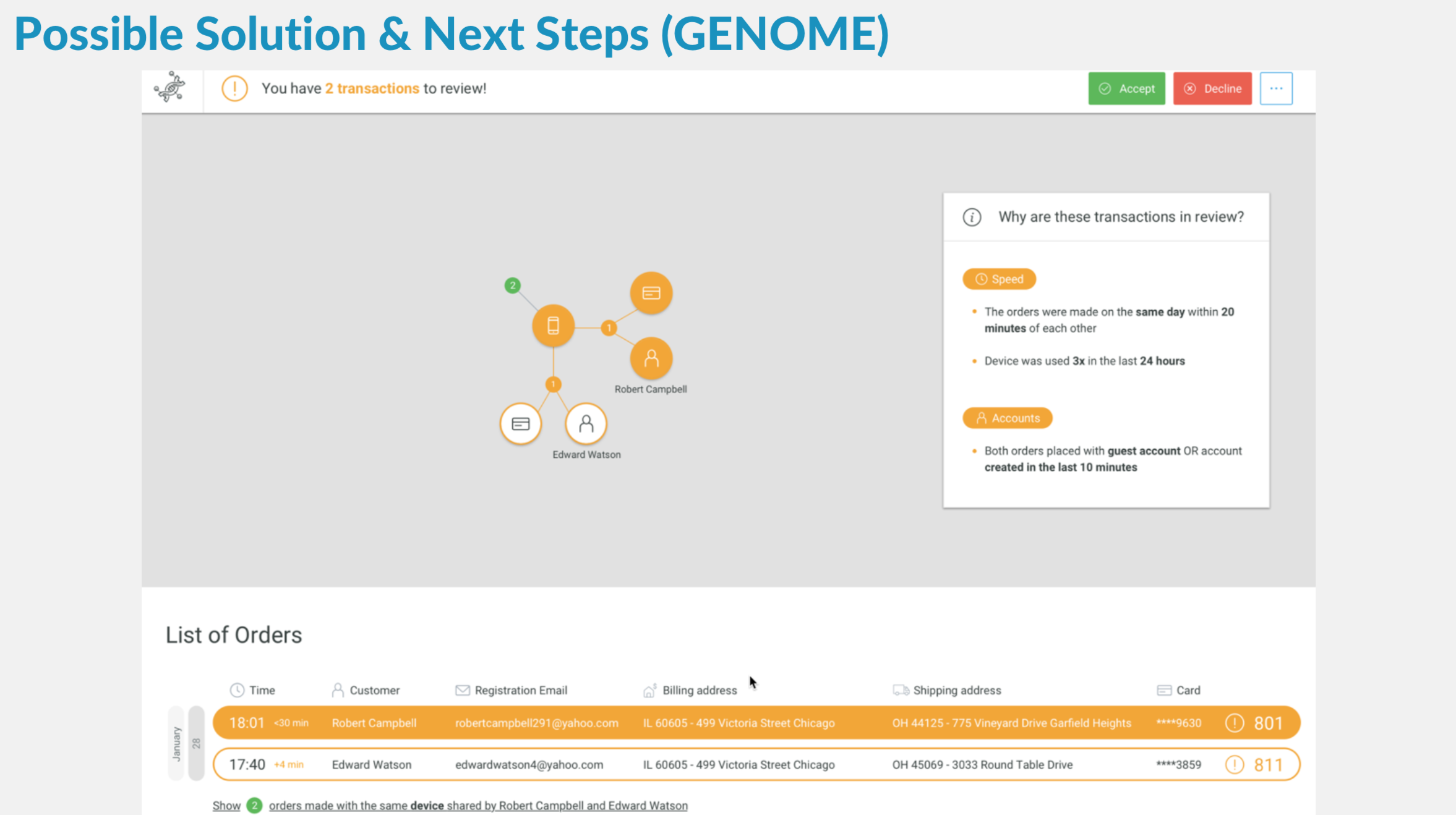 If something seems suspicious (such as: the same credit card being used in random places throughout the world or credit cards being used in dangerous geographical zones) then Genome would let the user know.