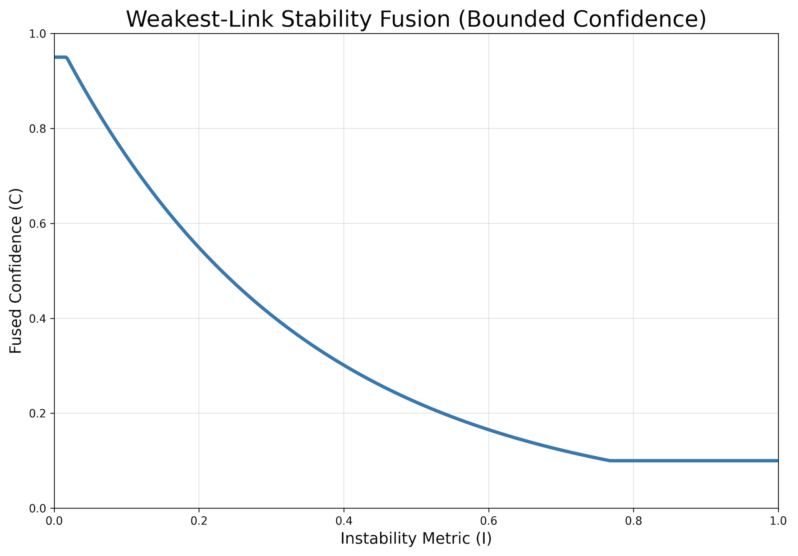 As instability increases, fused confidence contracts monotonically and remains explicitly bounded within defined limits.